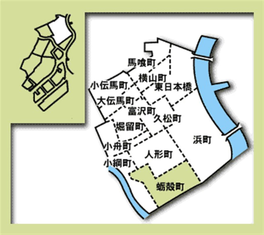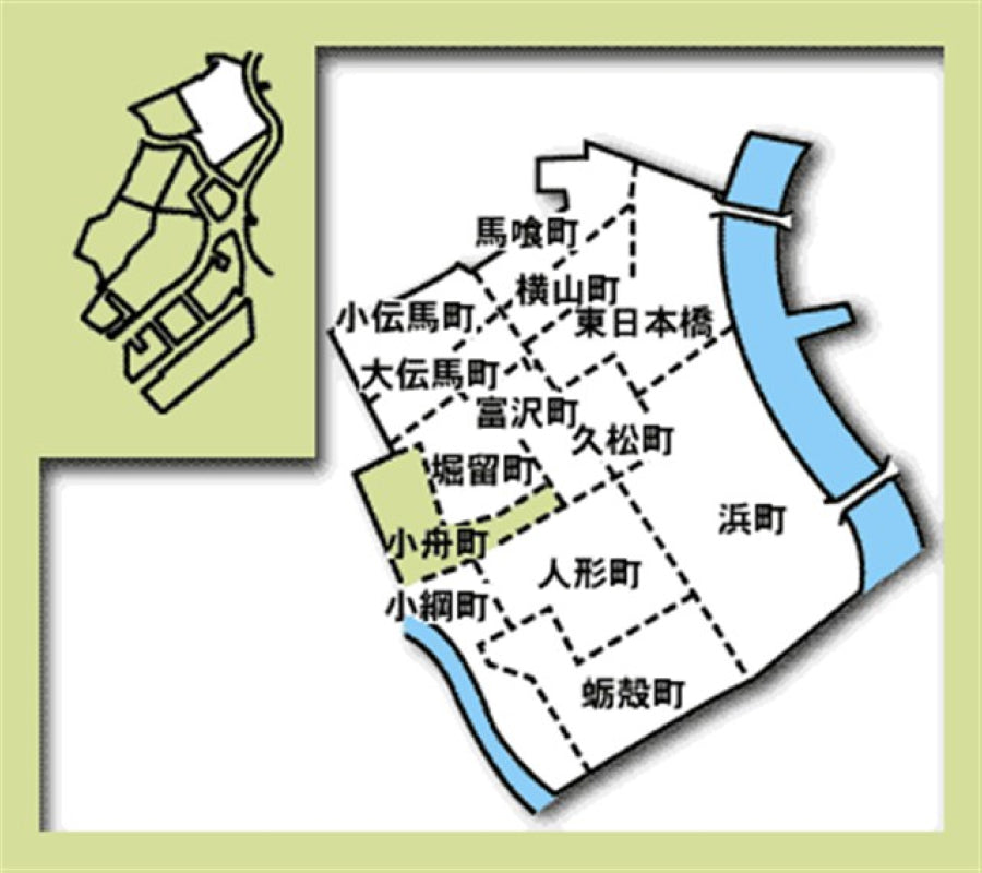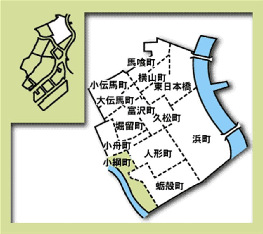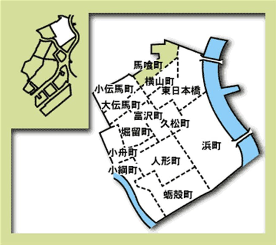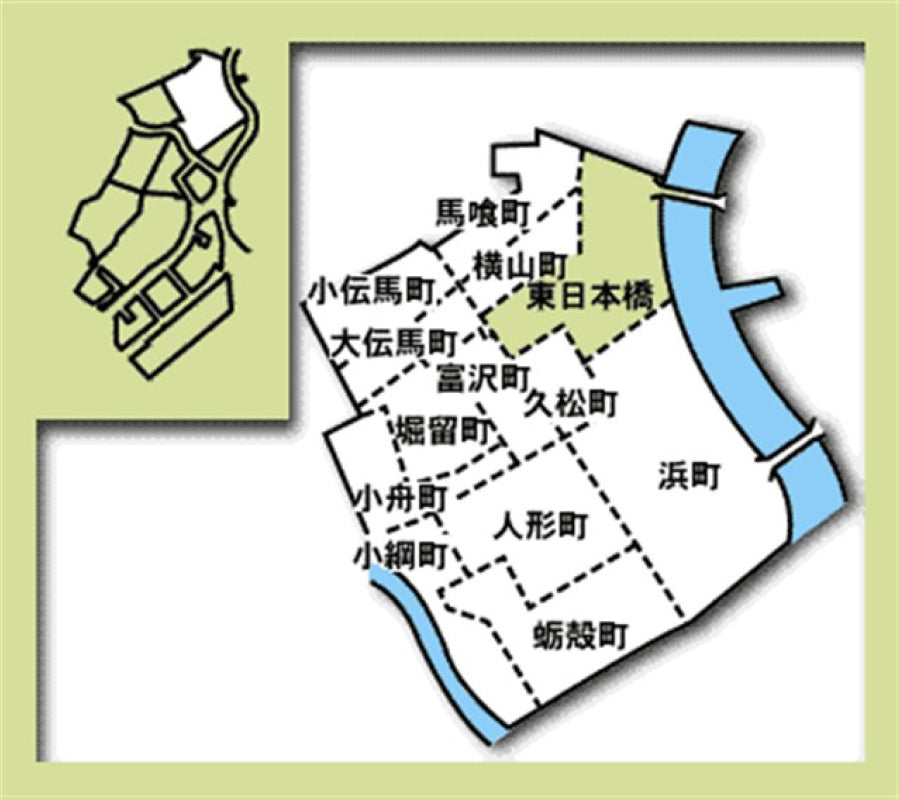 이 지역의 마을들은 각각의 얼굴을 가지고 있습니다.나카무라자·이치무라자가 있던 서민의 마을 “인형초”에는 많은 인형사가 살고, 중요한 가도근이었던 “마바미초·요코야마초” 부근에는 도매상이 발전했습니다.「하마쵸・쿠마쓰쵸」라고 하면 멋진 저씨가 오간 마을, 메이지자리가 있는 마을로서 알려져 있습니다만, 이 계쿠마는 무가 저택이 많은 곳이었습니다.짐을 말의 등에 쌓아 옮기는 덴마역을 맡는 사람들이 많이 살고 있던 「고덴마초・오덴마초」.「히가시니혼바시」는 료쿠바시・야나기바시 등의 일대에 있던 야쿠켄호리마치・무라마쓰초・야노쿠라마치・타치바나쵸 등의 마을명을 통합한 마을로, 현지의 사람은 지금도 오래된 마을명으로 서로 부르고 있습니다.「코후나쵸・호리루쵸・토미사와쵸」 일대는, 상인들이 물자를 운반하는 호리루가와에서 부를 이루고, 옛날에는 해변이었던 「카키가라쵸」는 다이묘 저택과 기모토 저택이 늘어선 지역이었습니다.「코아미쵸」에는 200년 이상 계속되는 가게가 지금도 영업하고 있으며, 한때 오카와의 불꽃놀이로 활기를 보인 「나카스」나 무가지였던 「하코자키쵸」는 상공업의 마을로서 발전 1882년(1882)에 개업된 일본 금융기관의 총원단결 「일본은행 창업의 땅」으로서 알려져 있습니다.