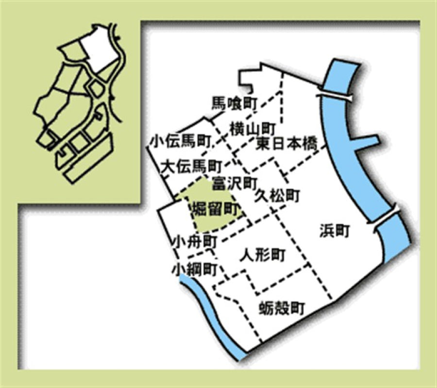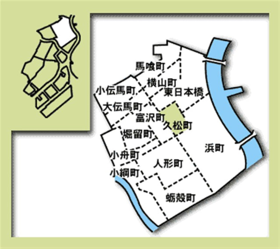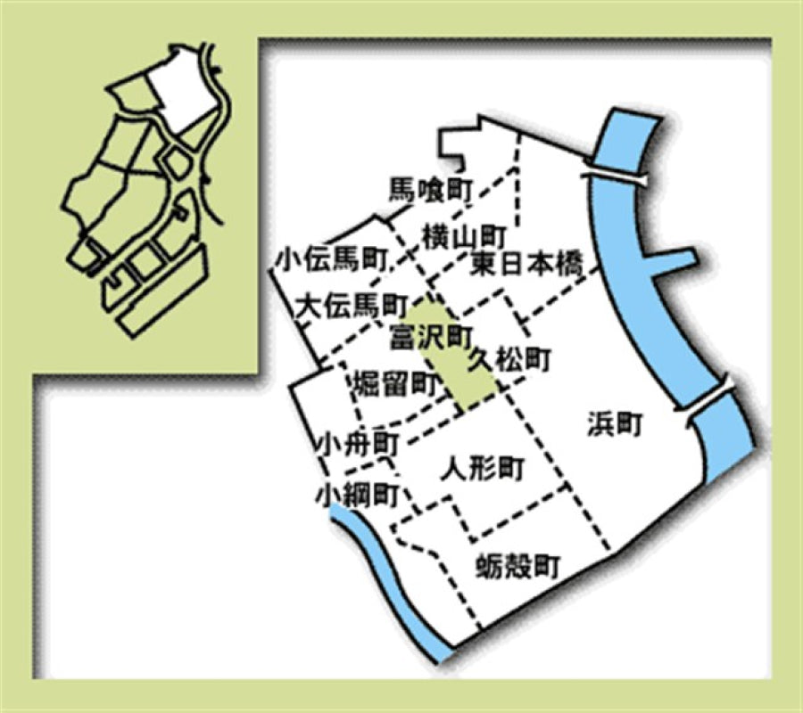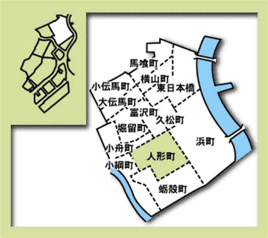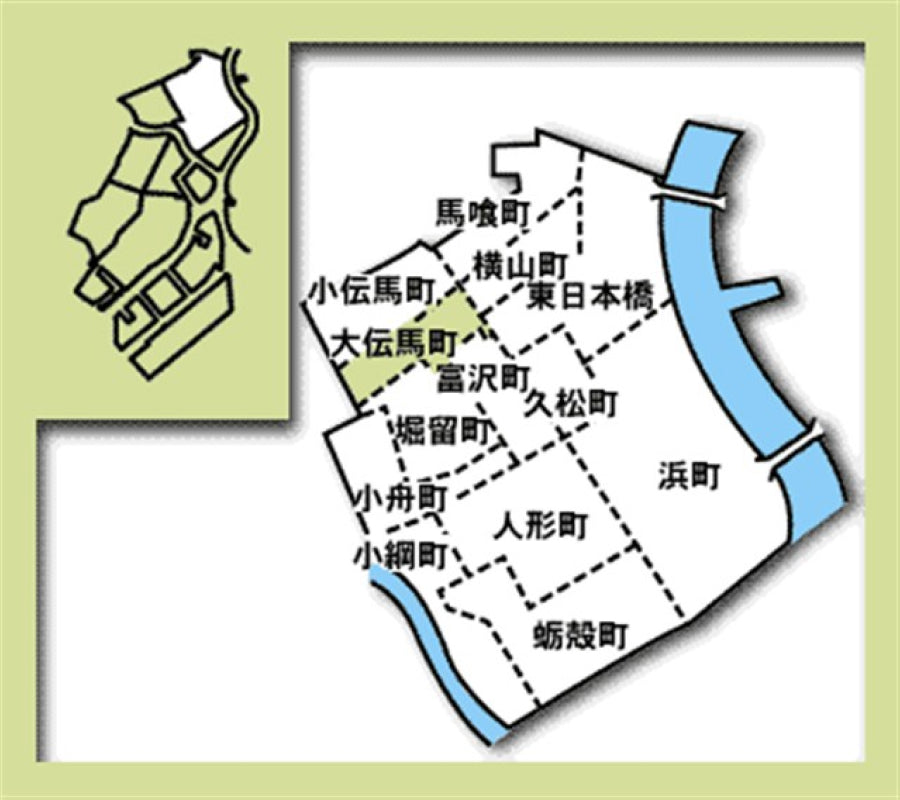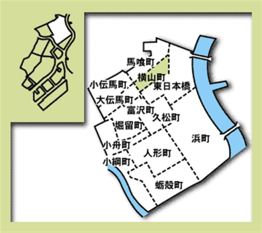 이 지역의 마을들은 각각의 얼굴을 가지고 있습니다.나카무라자·이치무라자가 있던 서민의 마을 “인형초”에는 많은 인형사가 살고, 중요한 가도근이었던 “마바미초·요코야마초” 부근에는 도매상이 발전했습니다.「하마쵸・쿠마쓰쵸」라고 하면 멋진 저씨가 오간 마을, 메이지자리가 있는 마을로서 알려져 있습니다만, 이 계쿠마는 무가 저택이 많은 곳이었습니다.짐을 말의 등에 쌓아 옮기는 덴마역을 맡는 사람들이 많이 살고 있던 「고덴마초・오덴마초」.「히가시니혼바시」는 료쿠바시・야나기바시 등의 일대에 있던 야쿠켄호리마치・무라마쓰초・야노쿠라마치・타치바나쵸 등의 마을명을 통합한 마을로, 현지의 사람은 지금도 오래된 마을명으로 서로 부르고 있습니다.「코후나쵸・호리루쵸・토미사와쵸」 일대는, 상인들이 물자를 운반하는 호리루가와에서 부를 이루고, 옛날에는 해변이었던 「카키가라쵸」는 다이묘 저택과 기모토 저택이 늘어선 지역이었습니다.「코아미쵸」에는 200년 이상 계속되는 가게가 지금도 영업하고 있으며, 한때 오카와의 불꽃놀이로 활기를 보인 「나카스」나 무가지였던 「하코자키쵸」는 상공업의 마을로서 발전 1882년(1882)에 개업된 일본 금융기관의 총원단결 「일본은행 창업의 땅」으로서 알려져 있습니다.