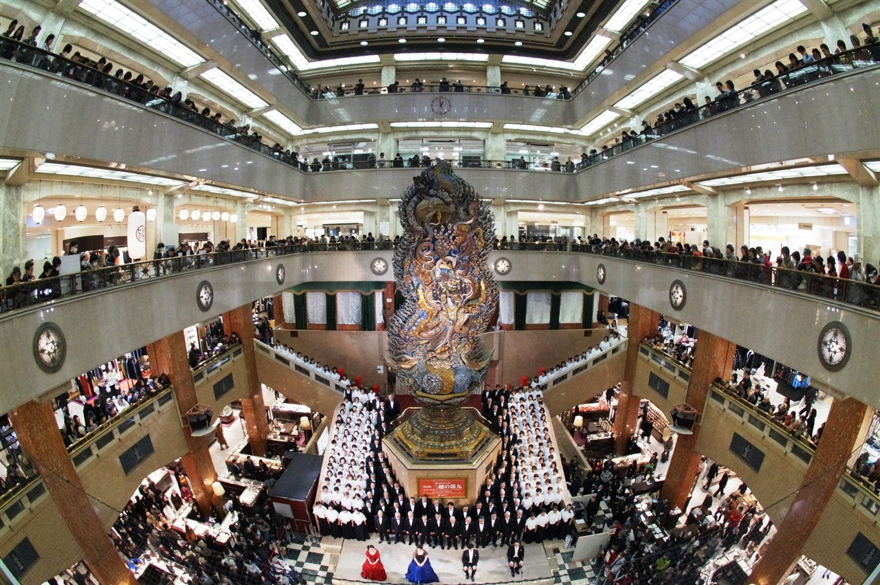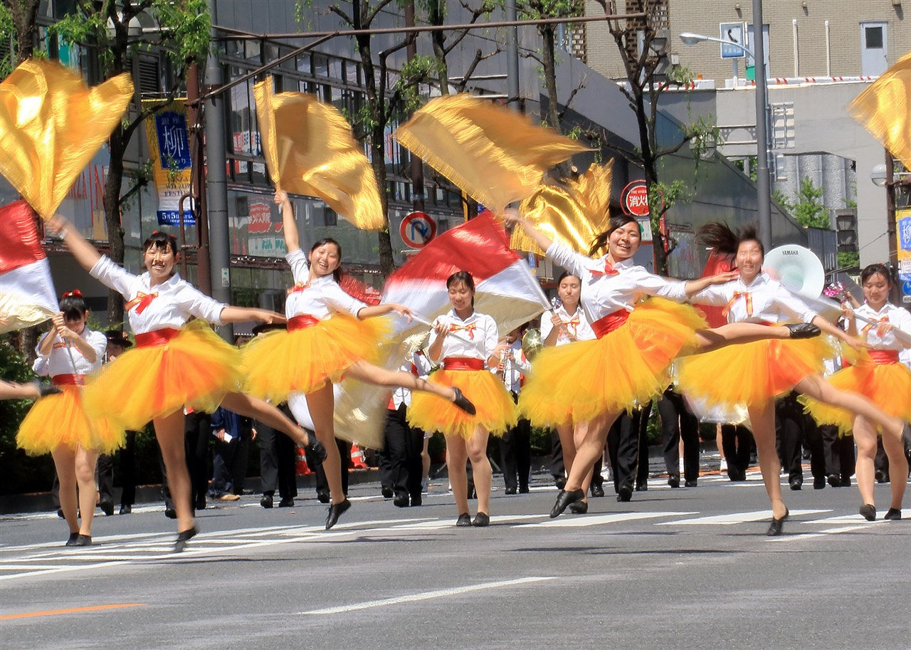 해마다 외국인 관광객이 늘고 있는 가운데, 붉은 화우산으로 화의 분위기를 연출한 긴자의 보행자 천국그 큰 무대에서 기념 사진을 찍는 두 명의 외국인 여성의 배우가 된 것 같은 천진난만한 모습과 마음껏 보내는 주위의 사람들의 모습으로부터 보행자 천국의 날의 즐거움과 개방감이 전해져 옵니다.