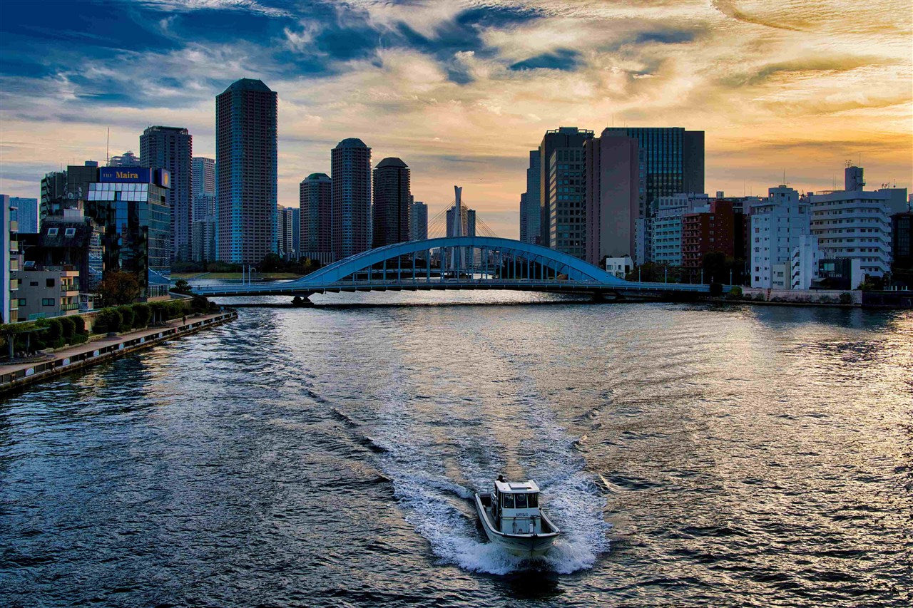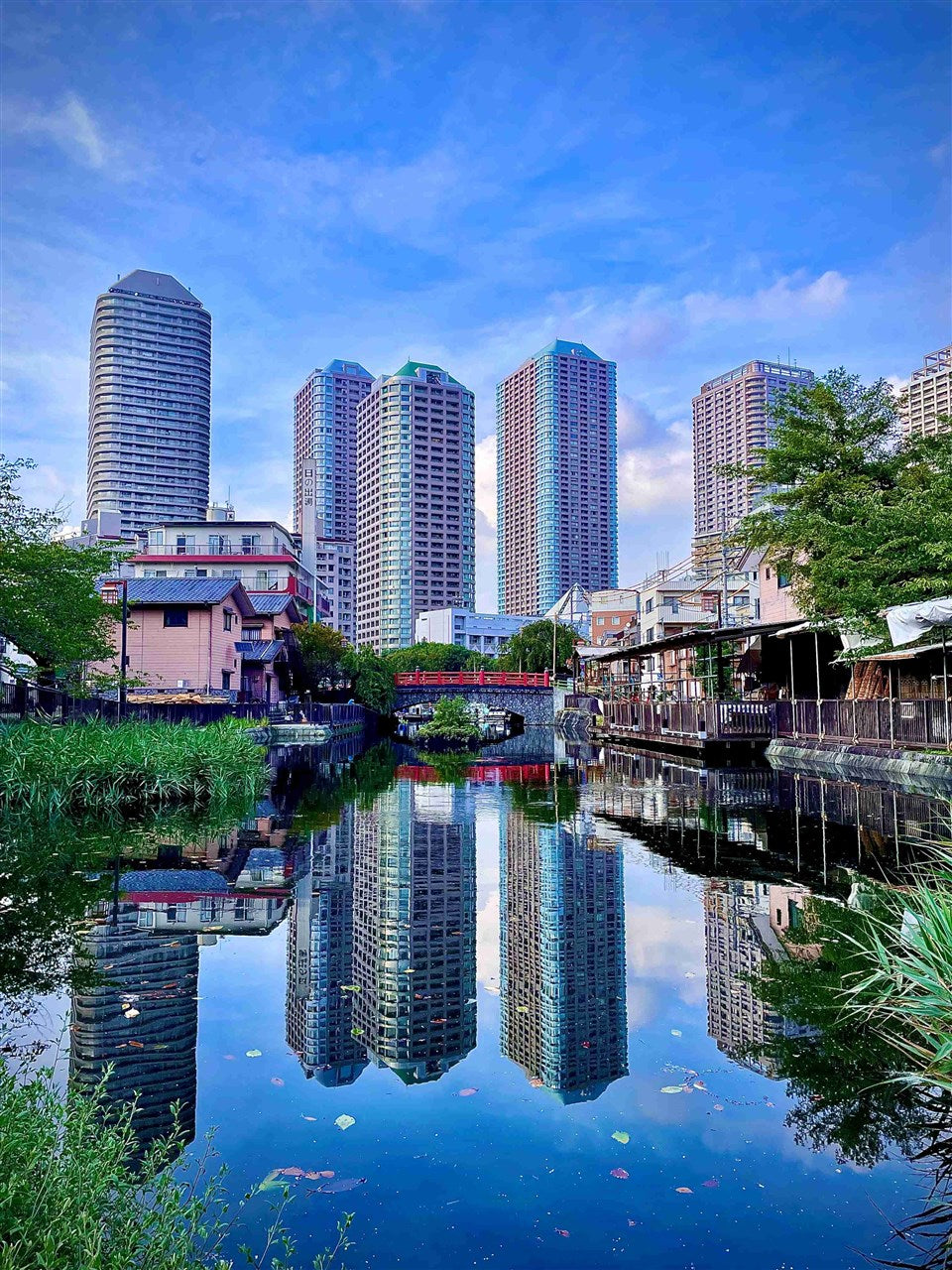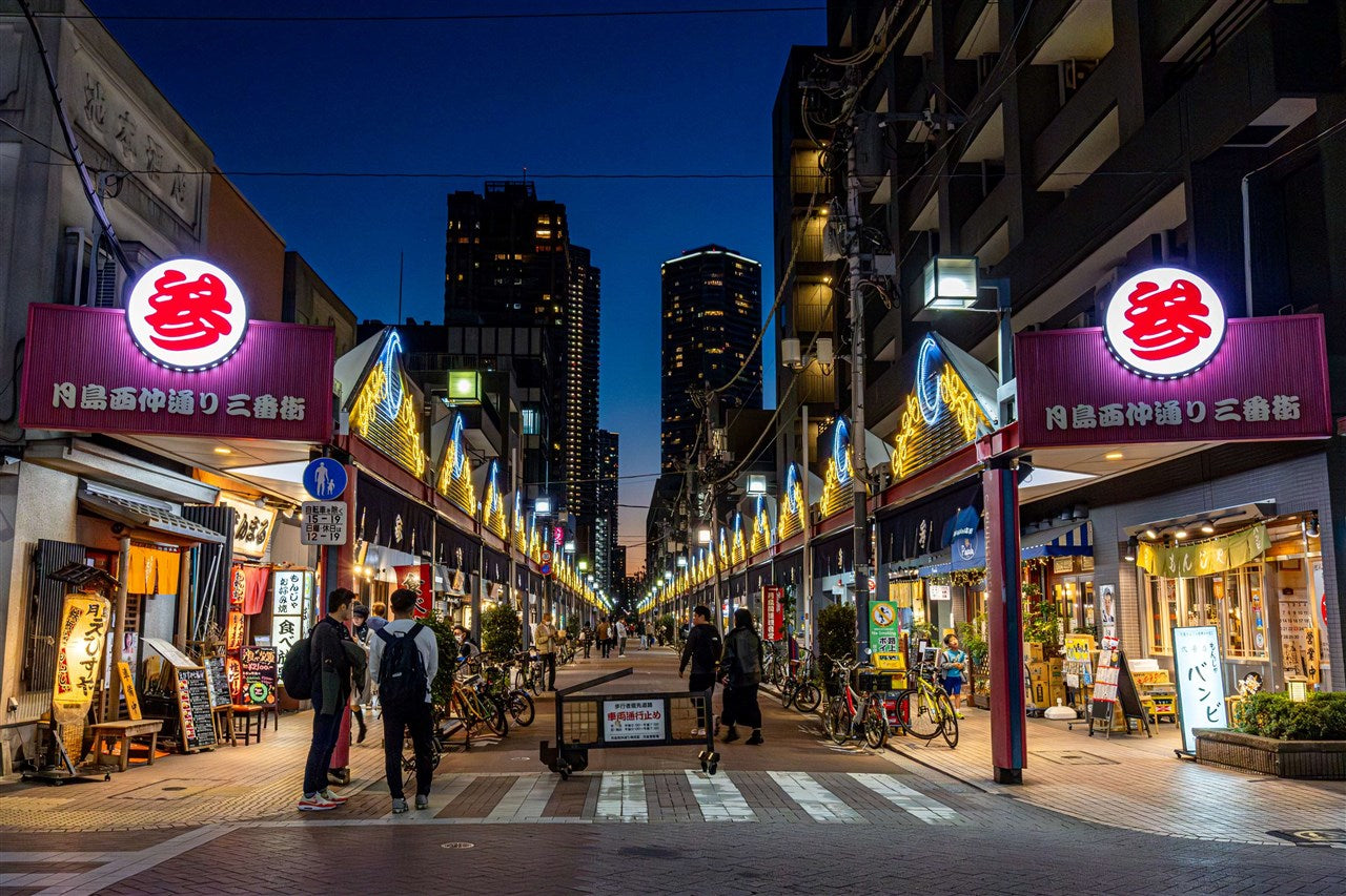 츠키시마를 산책해, 명물 도자이 가게가 늘어선 츠키시마 니시나카도리 상점가에서 되돌아 보면, 활기찬 거리와 그 앞에는 승도의 고층 빌딩에 불이 켜기 시작한 황혼의 풍경이 펼쳐져 있었습니다.그 풍경을 츠키시마 산책의 추억에 촬영했습니다.