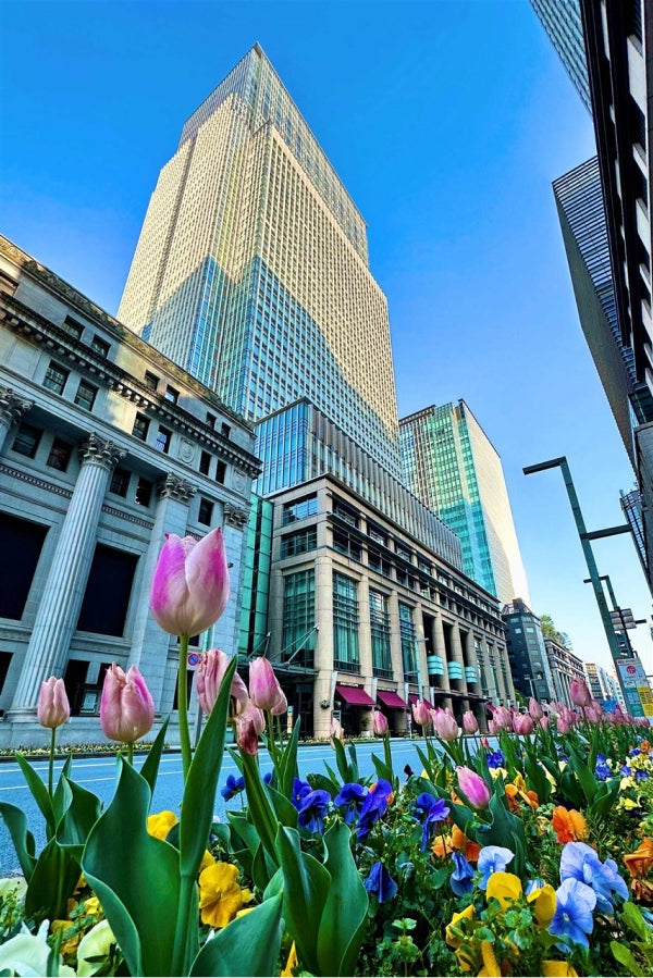 니혼바시 무로마치의 봄.주오도리의 보도에서는 화려한 튤립이나 팬지가 예쁘게 피어 나란히 행진을 하고 있었습니다.선명하게 맑은 하늘 아래 미쓰이 타워도 예쁜 행진을 즐기고 있습니다.날씨, 꽃이 피는 방법, 차나 사람이 없는 타이밍을 노리는데 고생했습니다.