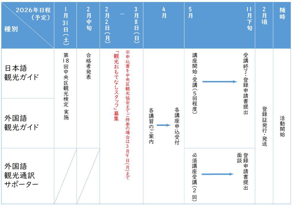 - 각종 강습의 스케줄에 대해서는, 주오구 관광 검정의 합격 통지로 알려 드리겠습니다.